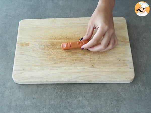 Um den Fingernagel herzustellen, zeichnen Sie am ungeschnittenen Ende ein Quadrat und entfernen dann die Haut der Straßburger Wurst.