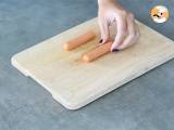 Schneiden Sie Ihre Würste in zwei Hälften und schneiden Sie dann die Oberseite ein: 3 auf der geschnittenen Seite, 2 auf der anderen Seite.