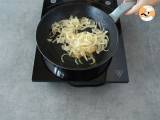Bereiten Sie die Zwiebel vor: Schneiden Sie die Zwiebel in Ringe. In einer Pfanne die Butter schmelzen und die Zwiebel darin glasig dünsten.