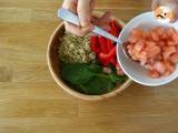 Dann fügen Sie neben der Quinoa den roten Pfeffer in Streifen und den geräucherten Lachs in Würfel geschnitten hinzu.