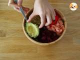 Legen Sie die Rübenwürfel neben den Lachs. Schneiden Sie den halben Avocado in Streifen und legen Sie ihn neben die Rüben.