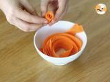 Schneiden Sie Ihre halbe Karotte in dünne Streifen und rollen Sie sie zu Rosen. Lege jede Rose in die Schüssel, nachdem du sie geformt hast, damit sie steht.