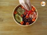 Mischen Sie die Zutaten für die Würze und gießen Sie die Soße über die Buddha Bowl.