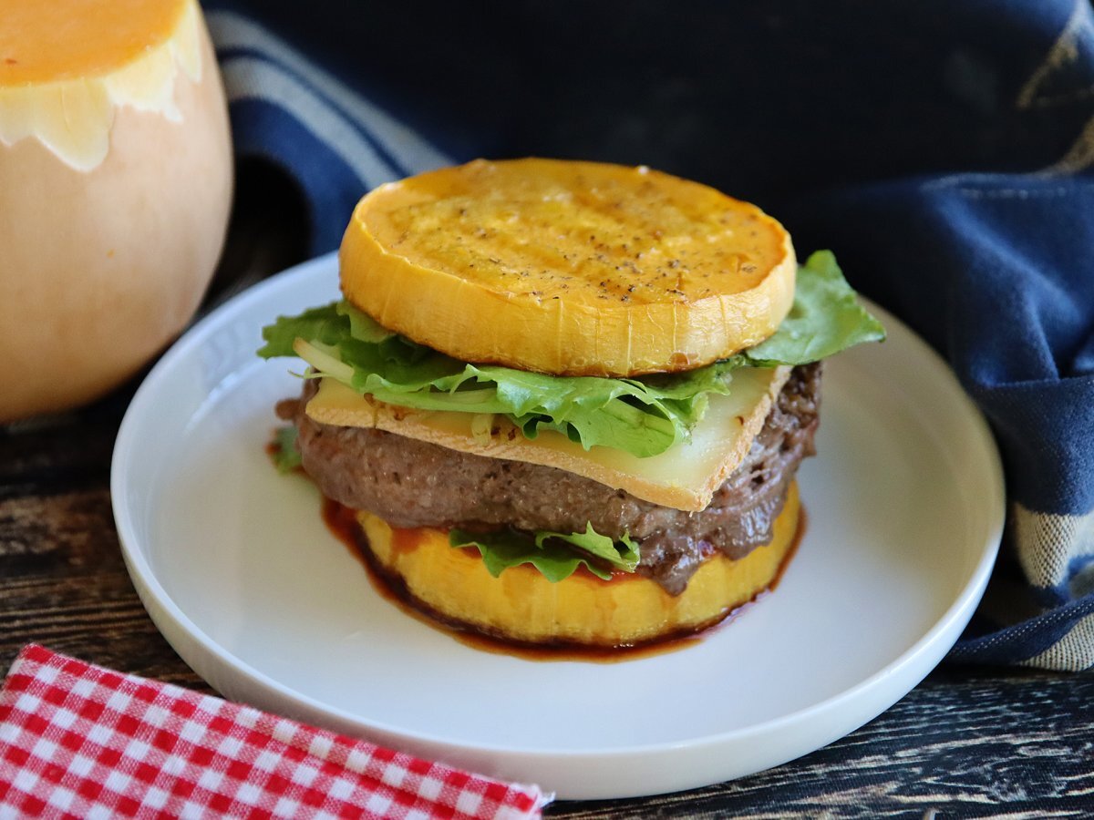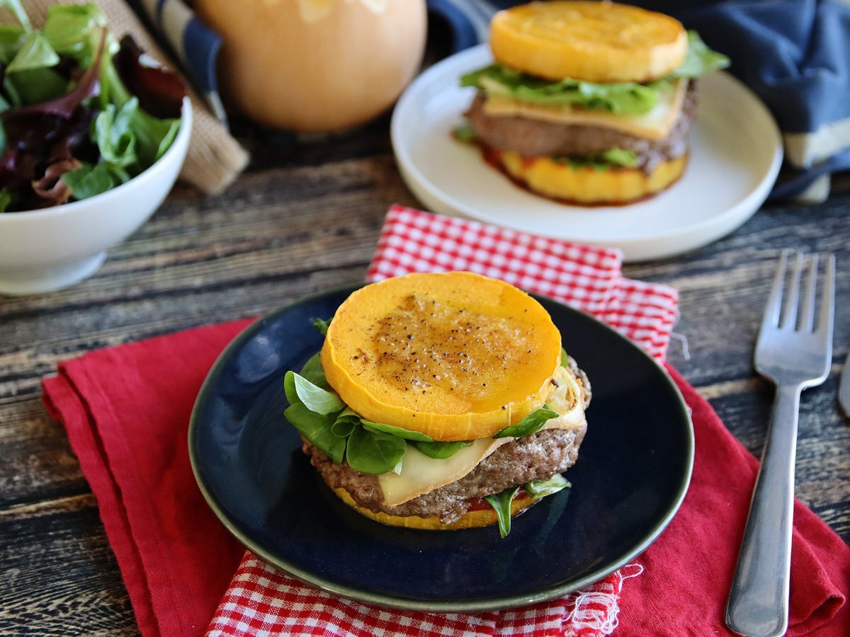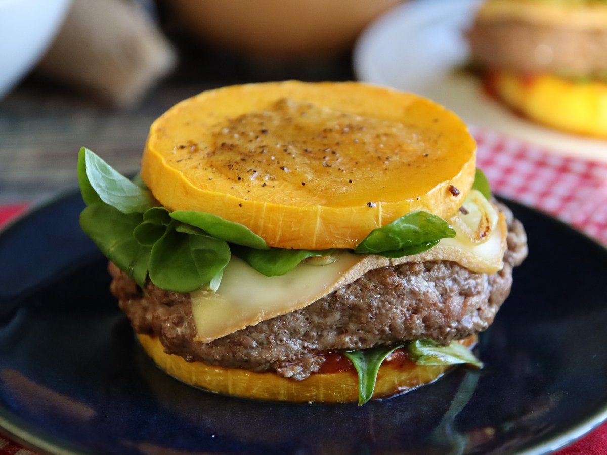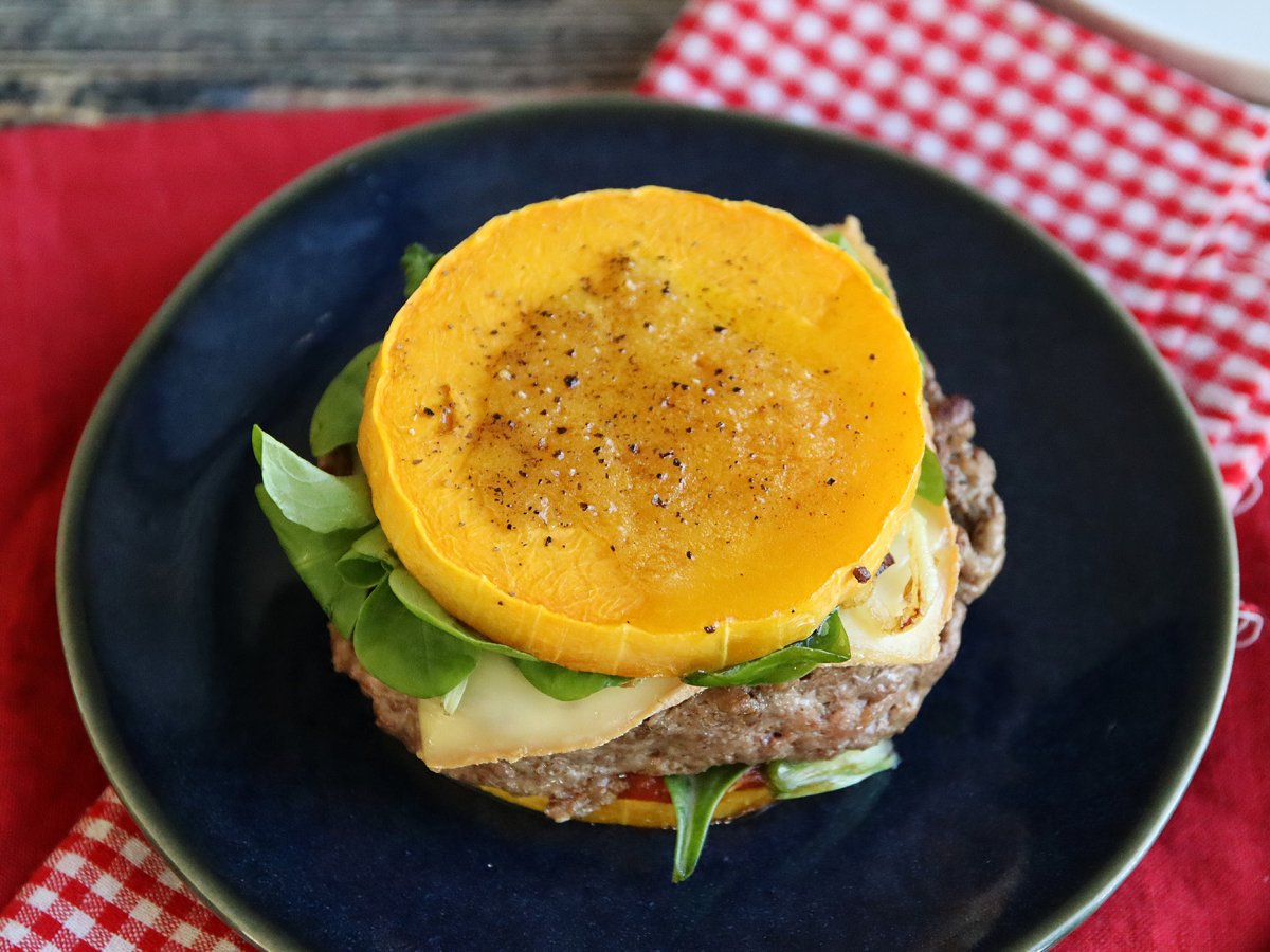 Wie wäre es, wenn wir den Butternut-Kürbis nicht nur in Suppen und Pürees verwenden würden? Tauschen Sie Ihr Brot gegen Butternut-Scheiben in Ihren Burgern aus! Das Ergebnis ist garantiert zartschmelzend und reich an Aromen ;-) Was den Belag Ihres Burgers angeht, überlassen wir es Ihnen, die Zutaten auszuwählen, die Sie zum Schwärmen bringen. Wir haben uns hier für ein gutes Rindersteak mit Raclettekäse, Salat und Tomatensoße entschieden: eine einfache und effektive Kombo.