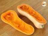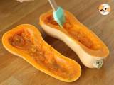 Den Backofen auf 190°C vorheizen. Den Kürbis der Länge nach halbieren und die Kerne entfernen. Das Innere auskratzen und das Fruchtfleisch in der entstandenen Mulde verteilen.