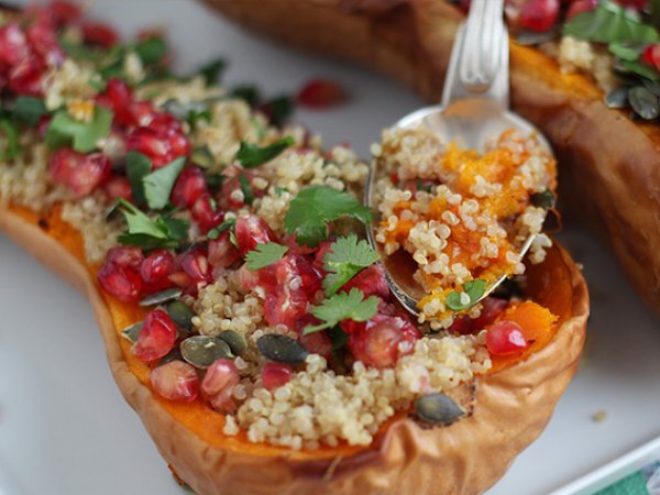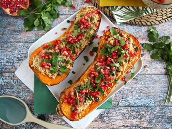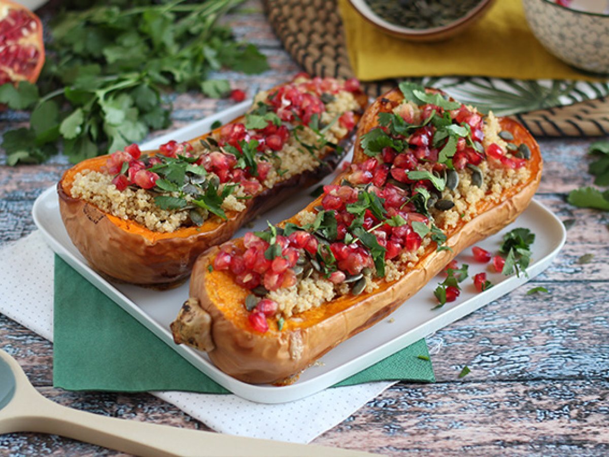 Wie lange dauert es, Butternut gefüllt mit Quinoa und Granatapfel zuzubereiten?