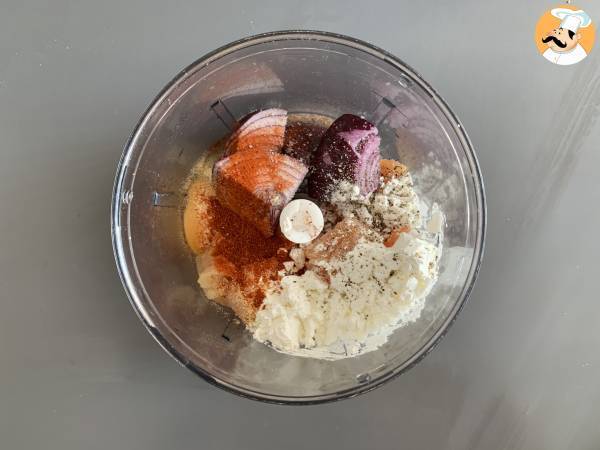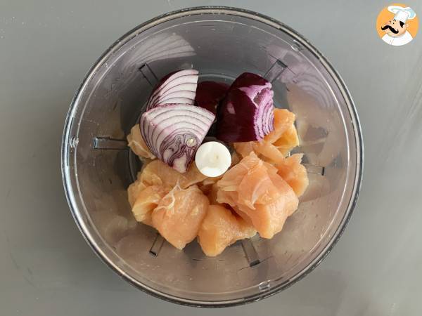 In einen Mixer geben und das Hühnchen und die Zwiebel in Stücke schneiden.