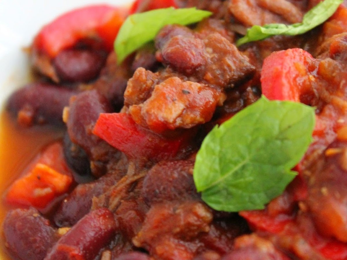 - Das Fleisch mit einem Kartoffelstampfer zerdrücken, dann Bohnen und Paprika zugeben. 30min ohne Deckel weitergaren. Das Fleisch soll vollständig zerfallen. Es ist nun sehr zart.