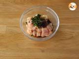 In eine Schüssel das in Stücke geschnittene Hähnchen, die Knoblauchzehe und den zerdrückten Ingwer, den gehackten Koriander, die Sojasauce und die Austernsauce geben. Gut vermischen und mindestens 1 Stunde kalt stellen.