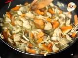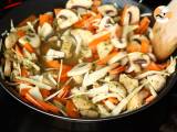 Wenn das Hähnchen zu garen beginnt, fügen Sie die in Streifen geschnittenen Karotten, den in dünne Streifen geschnittenen Kohl und die Pilze hinzu. 5 Minuten anbraten.