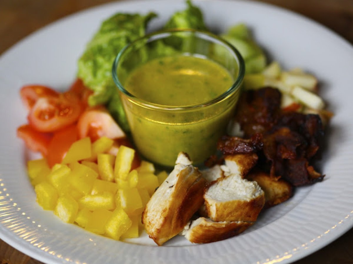 - Rühren Sie den Honig-Senf-Dressing mit Honig-Senf, Petersilie, Essig, Salz und Pfeffer.