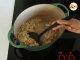 40 g Butter und das Olivenöl in einem Schmortopf erhitzen. Die fein geschnittenen Zwiebeln und die Speckwürfel hinzufügen. Alles zusammen anbraten. Abtropfen lassen, wenn sie goldbraun sind.