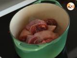 Die gesalzenen und gepfefferten Geflügelstücke in den Schmortopf geben und anbraten. Speckwürfel und Zwiebeln wieder in den Schmortopf geben und umrühren.