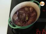 Langsam den Wein angießen, das Bouquet garni und die geschälten und zerdrückten Knoblauchzehen dazugeben.