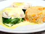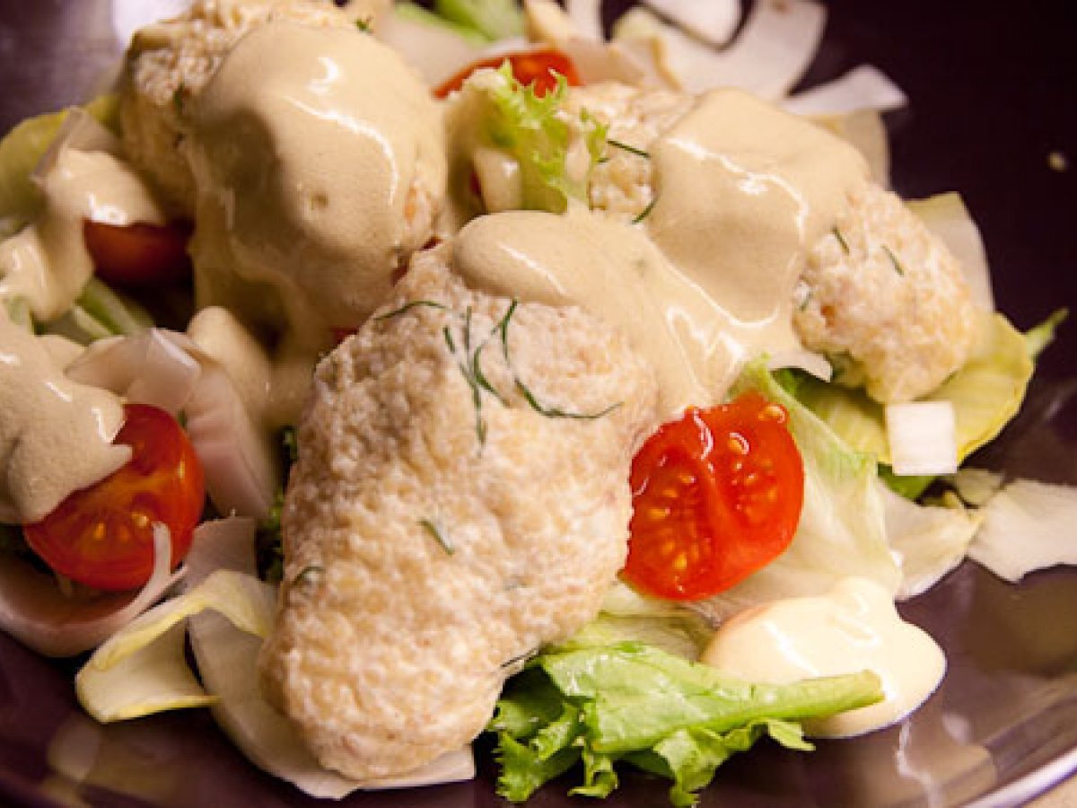 Cous cous gnocchi mit räucherforelle und senf-sauce auf chicorée