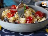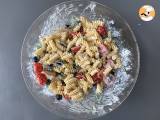 Wie Sie wissen, ist Nudelsalat auch ein hervorragendes Anti-Abfall-Rezept. Je nachdem, was Sie zur Verfügung haben, können Sie verschiedene Zutaten hinzufügen: Hier haben wir für eine superschnelle Variante nur Zutaten verwendet, die nicht gekocht werden mussten.