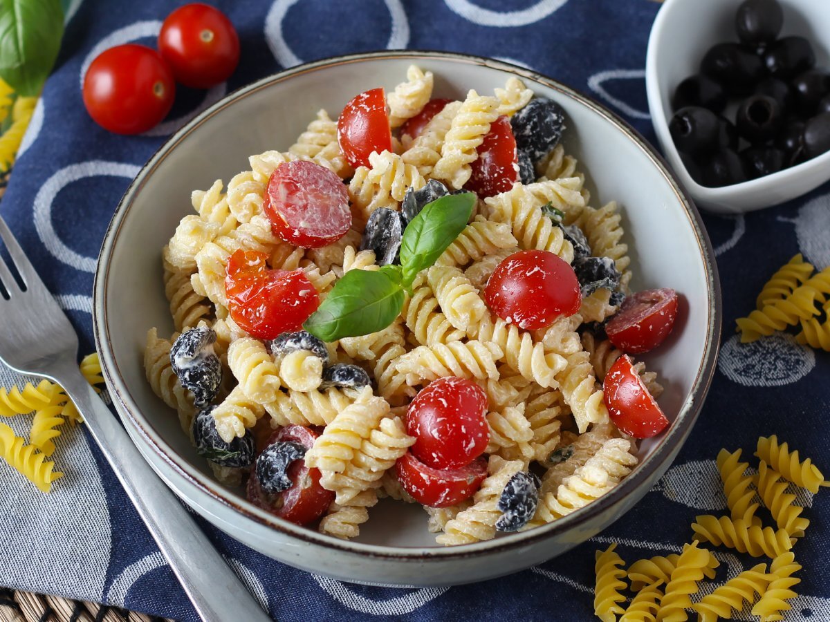 Geben Sie die Nudeln in eine Salatschüssel und fügen Sie dann die halbierten Kirschtomaten, die schwarzen Oliven (immer halbiert), die gehackten Basilikumblätter, einen Schuss Olivenöl und etwas Pfeffer hinzu. Gut vermischen, dann den Frischkäse dazugeben und erneut mixen, bis der Nudelsalat cremig ist.
