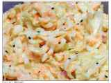 - Gemüseraspeln Mix in einer Schüssel mit 3-4 EL Mayonnaise, 1 EL mittelscharfer Senf, den Saft von 1 Limette, Salz und Pfeffer und Tabasco 2-3 Spritzer oder 1 TL scharfer Salsa.