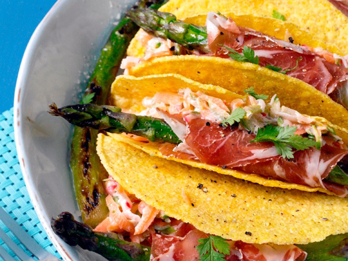 Cremiger spargel-coleslaw mit coppa-röllchen in der tacoschale