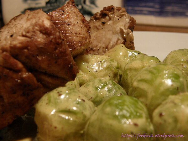 - 500 g Rosenkohl sauberen, feuchten, alternativ in Gemüsebrühe aufkochen (von 100 ml Brühe Rücklage).
