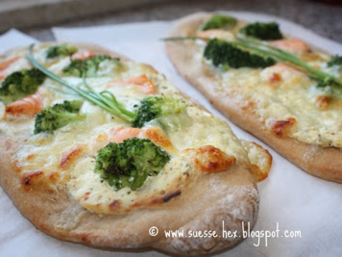 - Werfen Lachs, Brokkoli und Mozzarella auf sie.