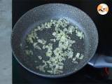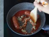 Tomatensoße, Kräuter der Provence und die zuvor gekochte Zwiebel dazugeben und zudecken. Bei schwacher Hitze 30 Minuten köcheln lassen.