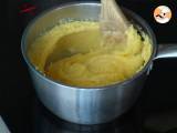 In einem Topf das Wasser mit dem Brühwürfel zum Kochen bringen. Nach und nach die Polenta unter ständigem Rühren in das Wasser rieseln lassen, damit sie eindickt (3 bis 5 Minuten). Den geriebenen Comté dazugeben und gut umrühren.