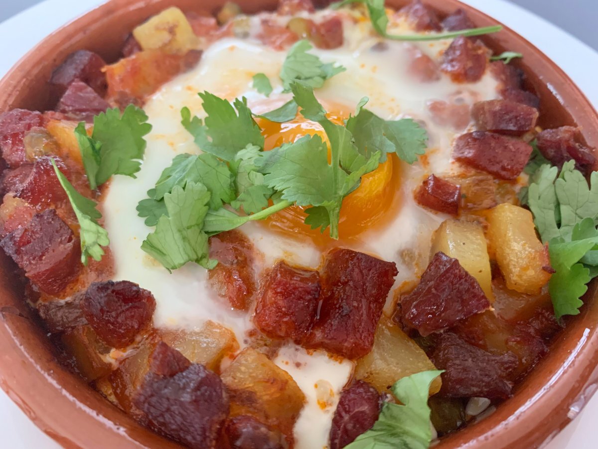 Eier nach flamenco-art mit kartoffeln und chorizo-wurst