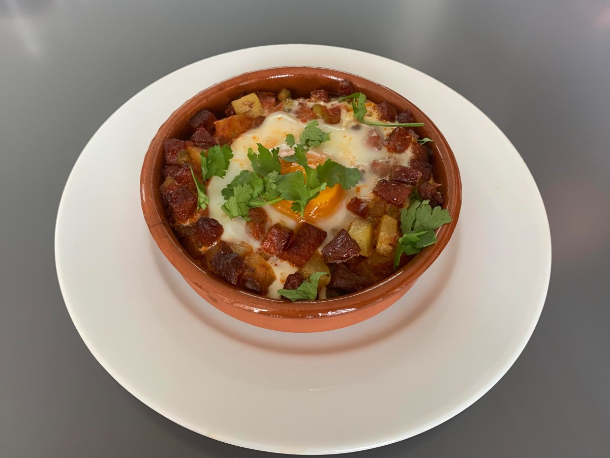 und ein paar Minuten kochen, bis alle Zutaten miteinander verbunden sind. - Mit Hilfe eines Löffels die Steingutform füllen und in der Mitte ein flaches Loch machen, damit das Eigelb in der Mitte liegt, wenn das Ei hinzugefügt wird. Das Ei aufschlagen und vorsichtig auf die Mischung legen.