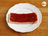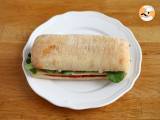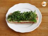 Den Rest der Soße auf der anderen Hälfte des Panini-Brots verteilen und das Sandwich verschließen.