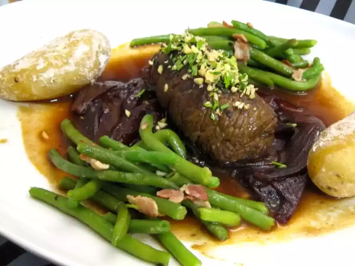 - Rest der Wein, Brühe, Lauch, Thymian und Pfeffer Lobeer, Salzen, Einlegen Rouladen und kochen ca. 45 Minuten.