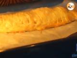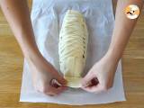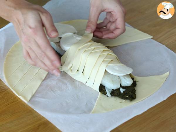 Den Blätterteig abwechselnd mit je einem Streifen auf jeder Seite über den Fisch flechten.