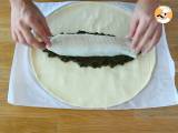 Schließen Sie die Ränder, indem Sie sie gut andrücken. Aus dem überschüssigen Teig einer Seite einen Schweif formen und diesen an einem Ende festkleben. Den Blätterteig mit Eigelb bestreichen.
