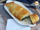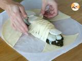 Den Blätterteig ausrollen. Den Spinat in der Mitte auftragen, so dass eine ovale Form entsteht. Den Kabeljau wieder auf den Spinat legen.