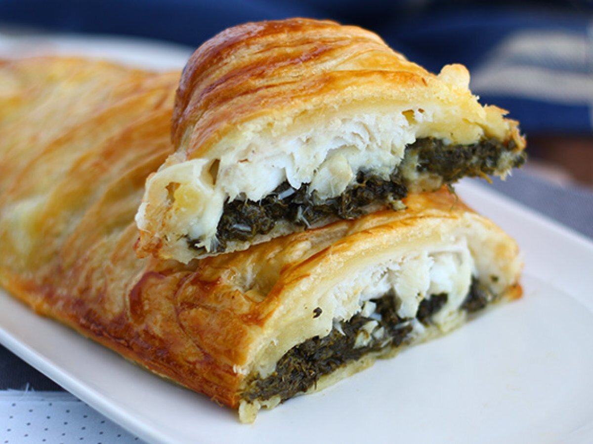 Fisch in einer blätterteigkruste mit spinat und mozzarella-käse