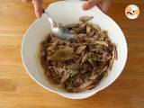 Nach Ablauf dieser Zeit gut abkühlen lassen, damit Sie das Fleisch verarbeiten können. Das Perlhuhn häuten, um das gesamtes Fleisch zu gewinnen, und die Schweinelende dünner machen. Die Schalotten halbieren und alles vermischen.
