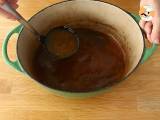 Die in der Kasserolle vorhandene Brühe auffangen und in einen Topf geben. Eine Stunde bei mittlerer Hitze unter gelegentlichem Rühren erhitzen, bis eine schöne cremige Sauce entsteht.
