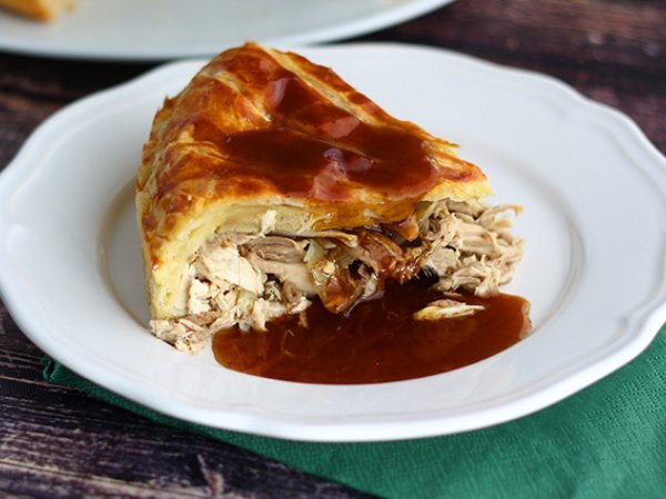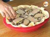 Legen Sie einen Blätterteig in die Springform und gießen Sie die Fleisch-Schalotten-Mischung hinein. Alles gut glattstreichen und anschließend mit Gänseleberscheiben belegen. Falten Sie die überstehenden Teigränder über die Füllung.