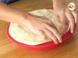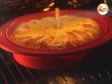 Mit einem zweiten Blätterteig bedecken und die Ränder unter den ersten Blätterteig schieben, sodass ein Kuchen entsteht. Machen Sie ein Loch in der Mitte und rollen Sie Pergamentpapier in einen Zylinder, um einen Kamin zu formen.