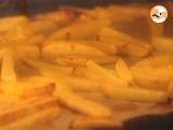 Bereiten Sie die Pommes Frites vor: Schälen Sie die Kartoffeln, schneiden Sie sie in Pommes Frites, vermischen Sie sie mit Olivenöl und Salz und legen Sie sie für 20 Minuten bei 220 °C auf ein mit Backpapier ausgelegtes Backblech in den Ofen.