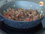 Bereiten Sie das Fleisch vor: Eine gehackte Zwiebel in Olivenöl anbraten, wenn sie glasig ist, das Hackfleisch, Salz und Pfeffer hinzufügen. Gelegentlich umrühren, bis es gar ist.