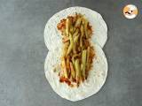 Zusammenbau: Die beiden Tortillas leicht übereinander legen. Verteilen Sie die Barbecue-Sauce (oder eine andere Sauce darauf, dabei die Ränder aussparen). Die Hälfte der Pommes in die Mitte legen.