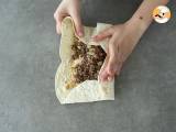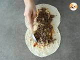 Die Hälfte der Käsesauce darüber geben und dann die Hälfte des Hackfleischs hinzufügen. Zentrieren Sie die Lebensmittel gut (ein Rechteck bildend), um das Falten zu erleichtern.