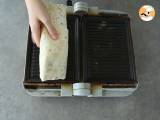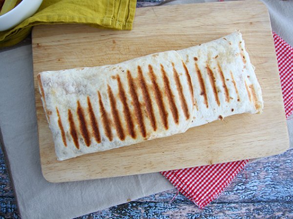 Drehen Sie die Tacos um und kochen Sie sie 3 Minuten lang in einem Panini-Maker (oder in einer Pfanne 3 Minuten lang auf jeder Seite, beginnend mit der Seite der Falte, um sie zu verschließen).