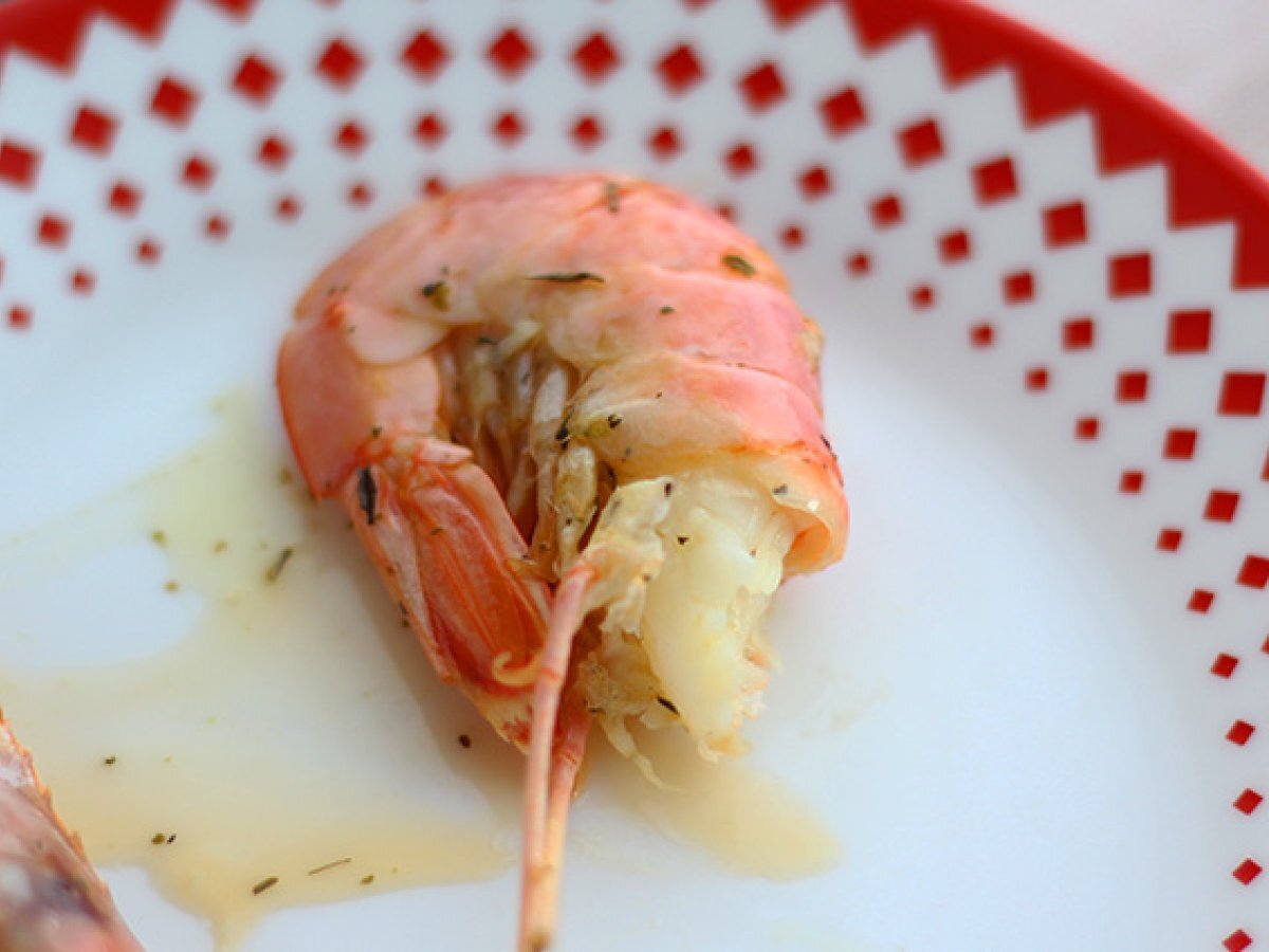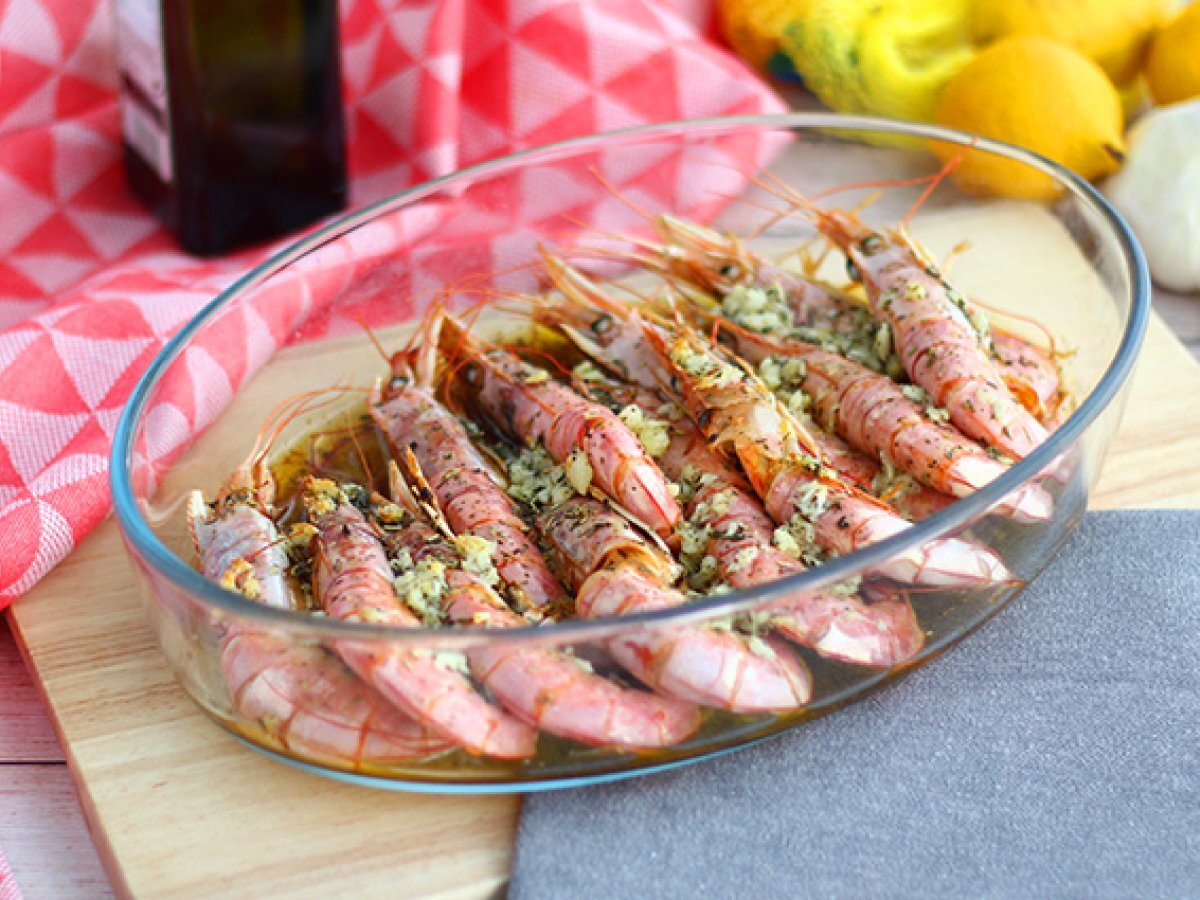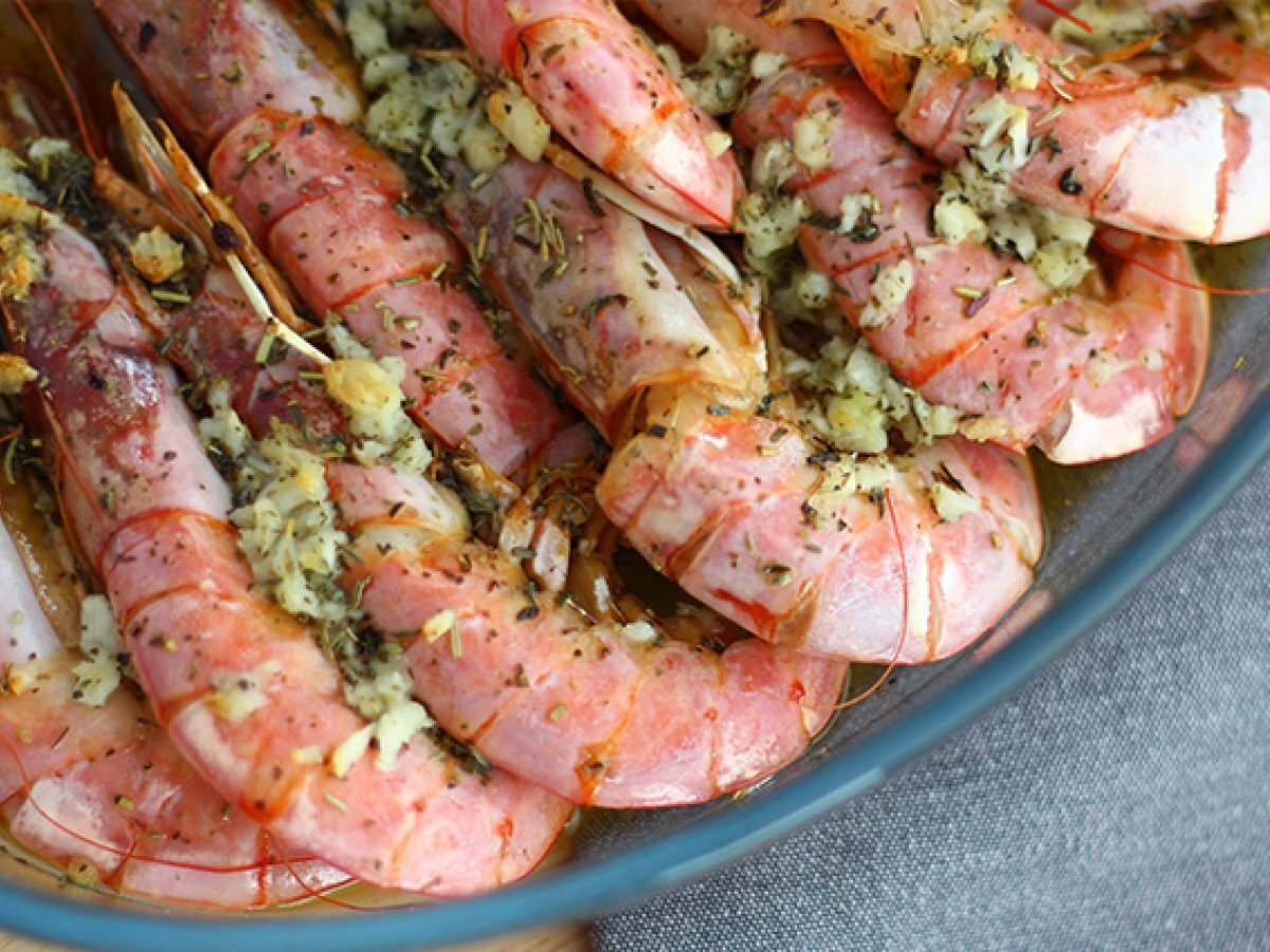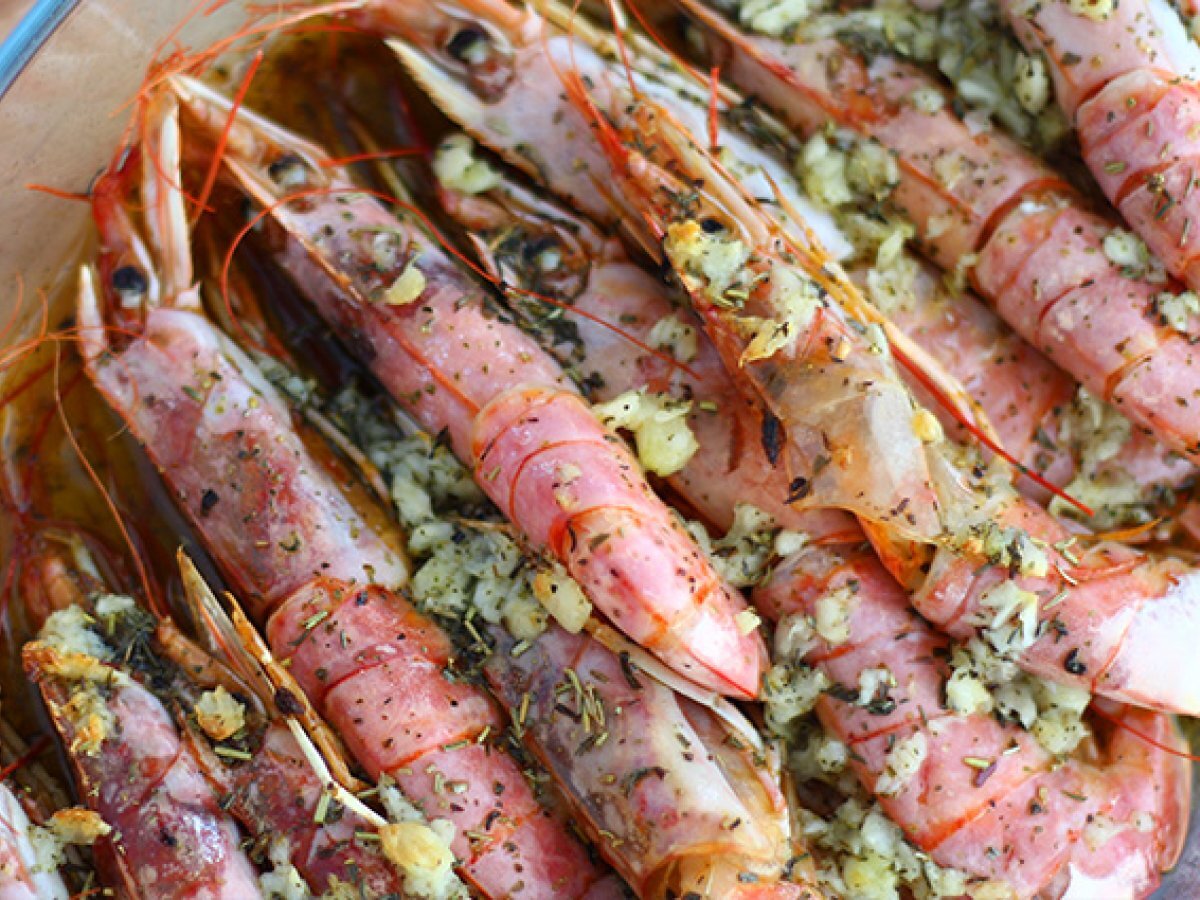 Gebackene gambas mit knoblauch und kräutern