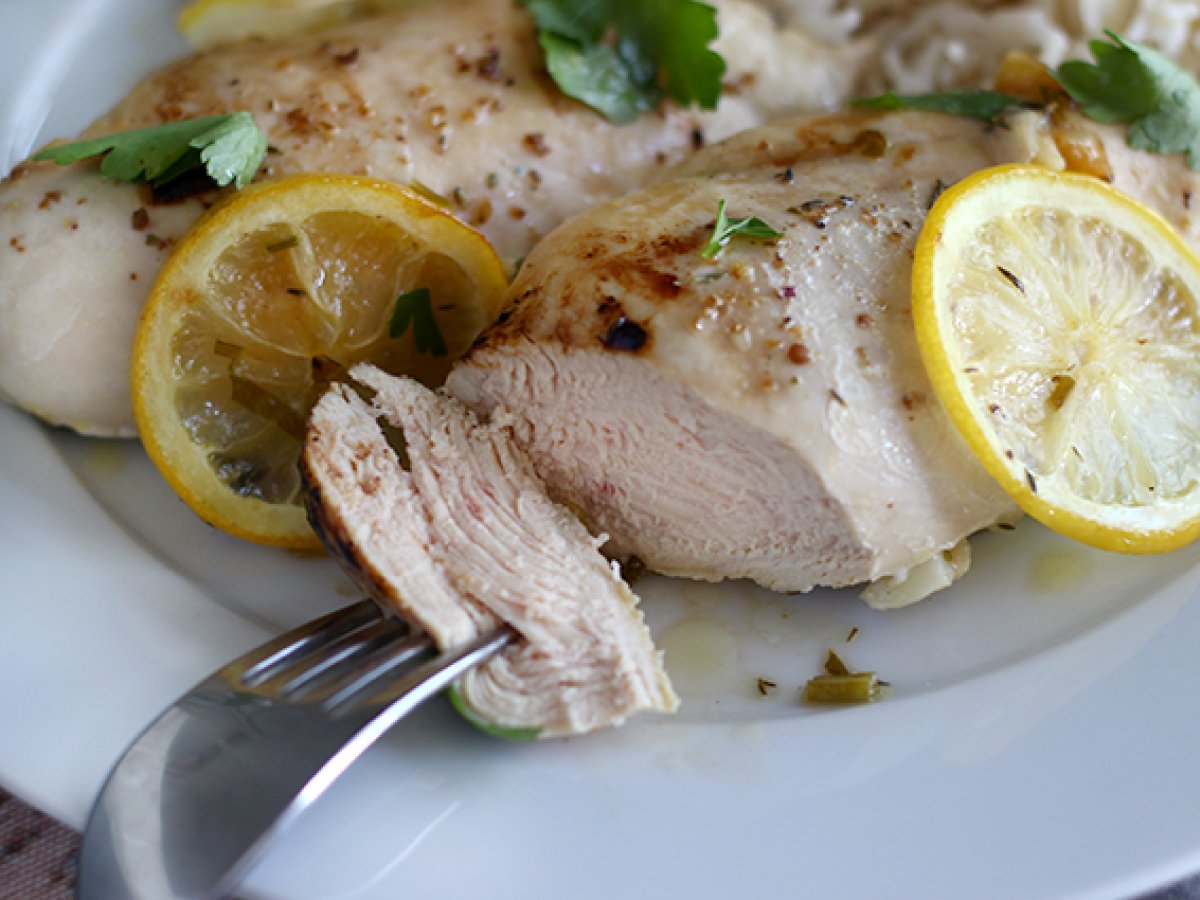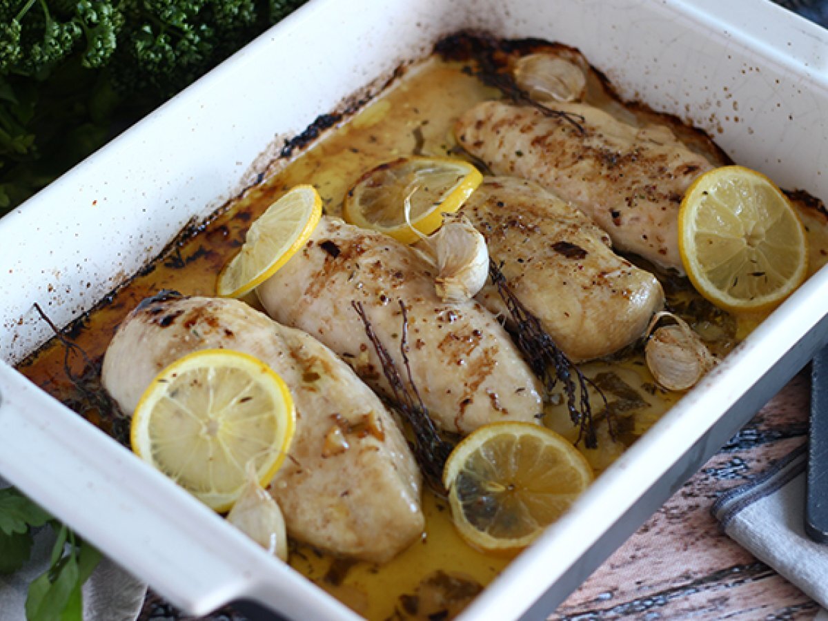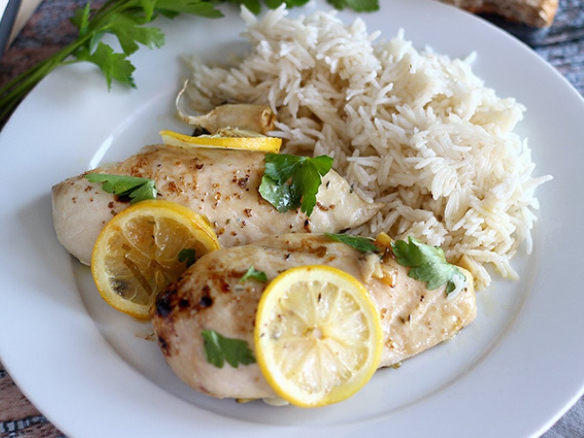 Dies ist ein sehr einfaches, schnelles und praktisches Rezept für Familienmahlzeiten. Es braucht überhaupt keine Zeit für die Zubereitung und kann allein im Ofen zubereitet werden, ohne die Küche zu verschmutzen. Das Gericht ist in einer halben Stunde fertig! Sie können diese Zitronen-Hühnerbrüste mit Basmatireis, Quinoa, Nudeln, gedünstetem Gemüse oder einem Salat servieren. Sie haben die Wahl, sind Sie dabei? :)