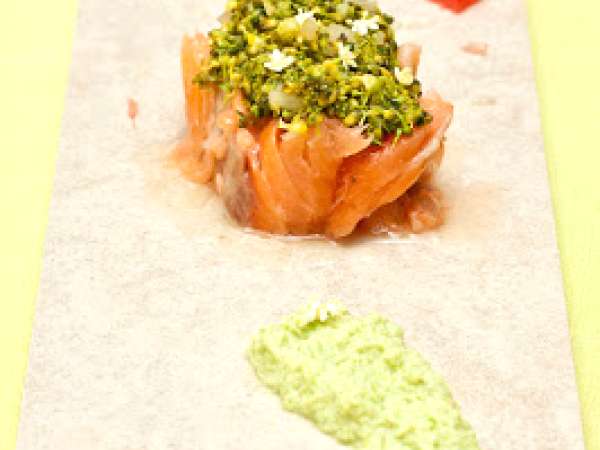 Gebeizter lachs mit avocado mousse an einer basilikum chili vinaigrette