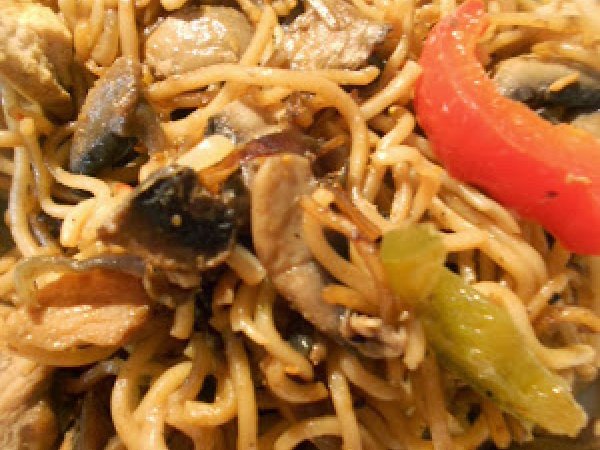 Gebratene nudeln mit gemüse und sojageschnetzeltem