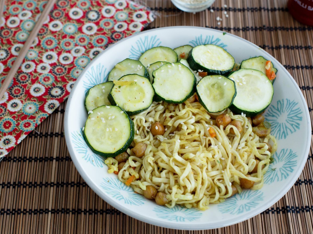 - Nudeln und Zucchini mit den Kichererbsen in die Pfanne geben und etwa 5 Minuten rühren.