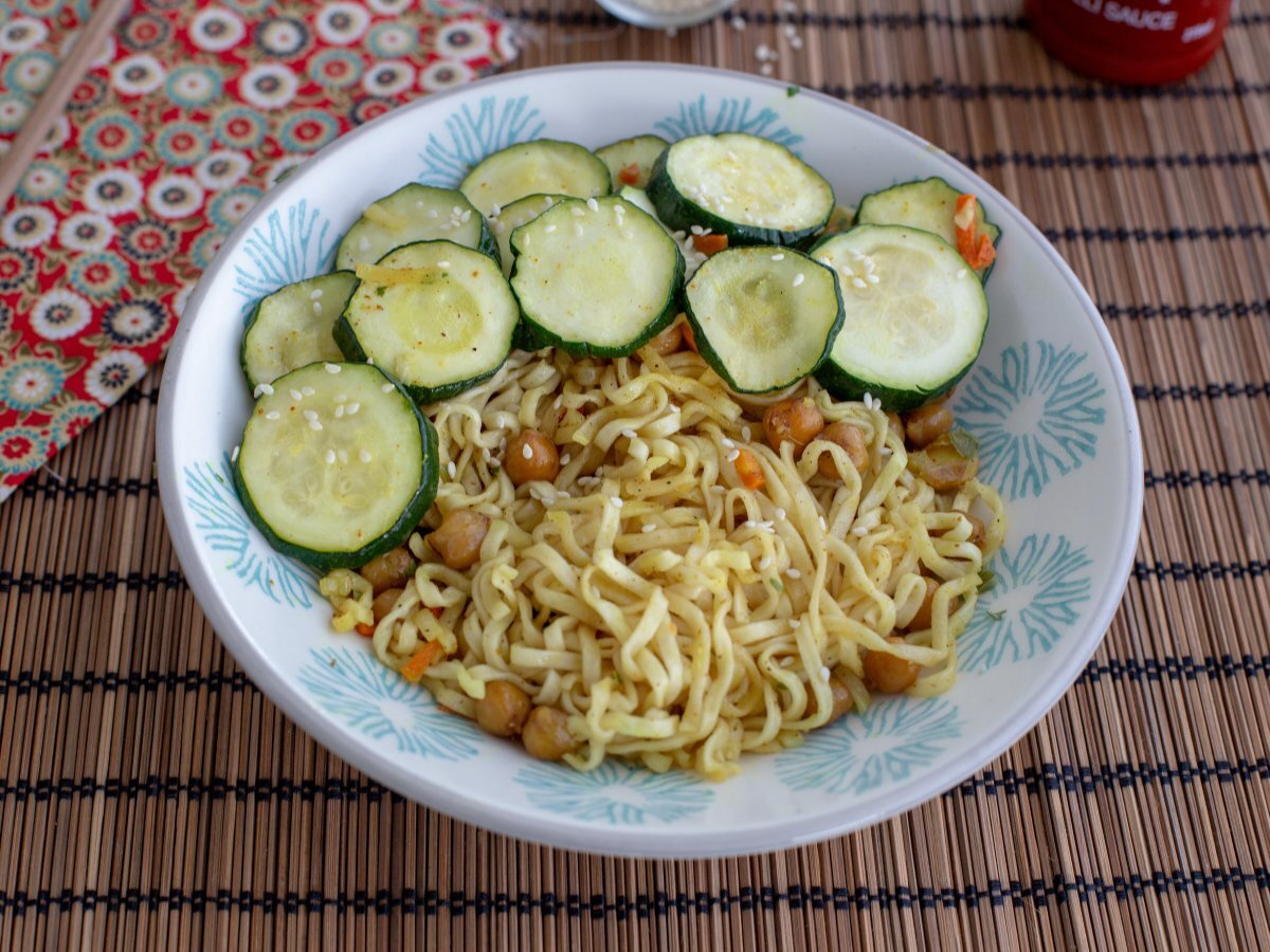 Chinesische Eiernudeln oder Reisnudeln sind ideal, da sie schnell garen und gut die Aromen aufnehmen.
